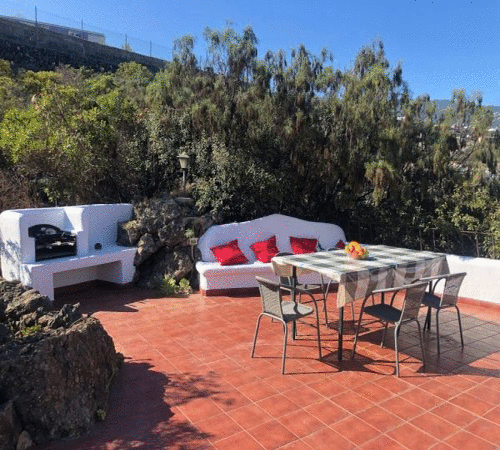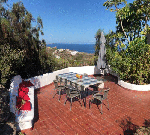 La hermosa terraza, rodeada de vegetación (aprox. 60 m²), solo es accesible desde el interior de la casa y no es visible desde el exterior. Se garantiza una vista espectacular al mar y al Teide.