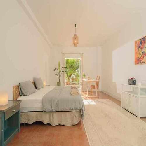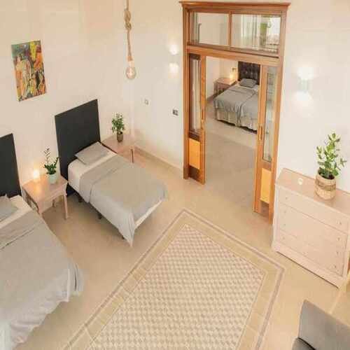 Spacious, clean room opening to a sunlit morning in the serene garden. This room type is recommended for retreat participants, garden enthusiasts, and those who appreciate waking up to the sunlight. Opposite the room, there is a fountain suitable for cold water immersion in the palm grove. The room is 60 m2, features a separate bathroom and a wardrobe. It is for 4 people only (shared, no single option). Shared double room with 4 separate beds.